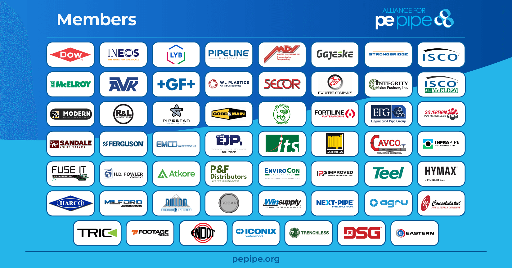 Welcome to the PE Alliance Membership page. The graphic above represents all of the Alliance members that are financially active annually. There are many ways our members get involved, but most of those ways center around the mutual desire of all of us to educate the users of HDPE pipe. So regardless of where you operate in the HDPE pipe value chain, you will know people and companies that are represented below.